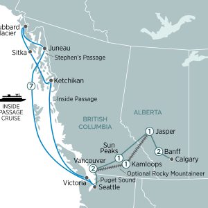 Be immersed in the highlights of the Canadian Rockies, exploring Vancouver, stunning Jasper National Park, Banff and Calgary then spend 7 days cruising the iconic Inside Passage and Glacier Bay.