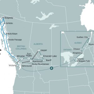 Tour the Rockies and enjoy the Rocky Mountaineer Rail Experience then cruise the Inside Passage. Explore the East Coast: Niagara Falls, Quebec, Montreal and more.