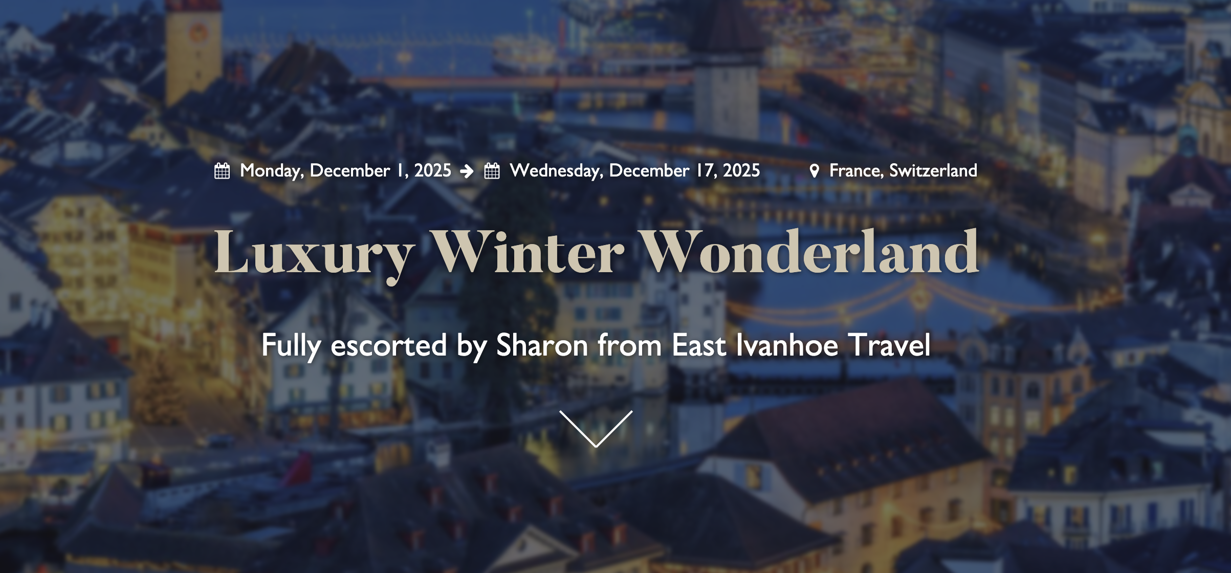 Exclusive to clients of East Ivanhoe Travel & Cruise…. Experience the charm of Switzerland and France at its finest during the peak of the festive season with Sharon and your very own Travel Concierge. Starting and ending in Zürich, spend 17 days immersed in lively Christmas markets, tasting local produce, and taking in the breathtaking snow-covered alpine landscapes with journeys aboard The GoldenPass Belle Epoque, cogwheel train to ”Top of Europe” and the traffic-free Alpine resort of Zermatt and finally the world-famous Glacier Express.