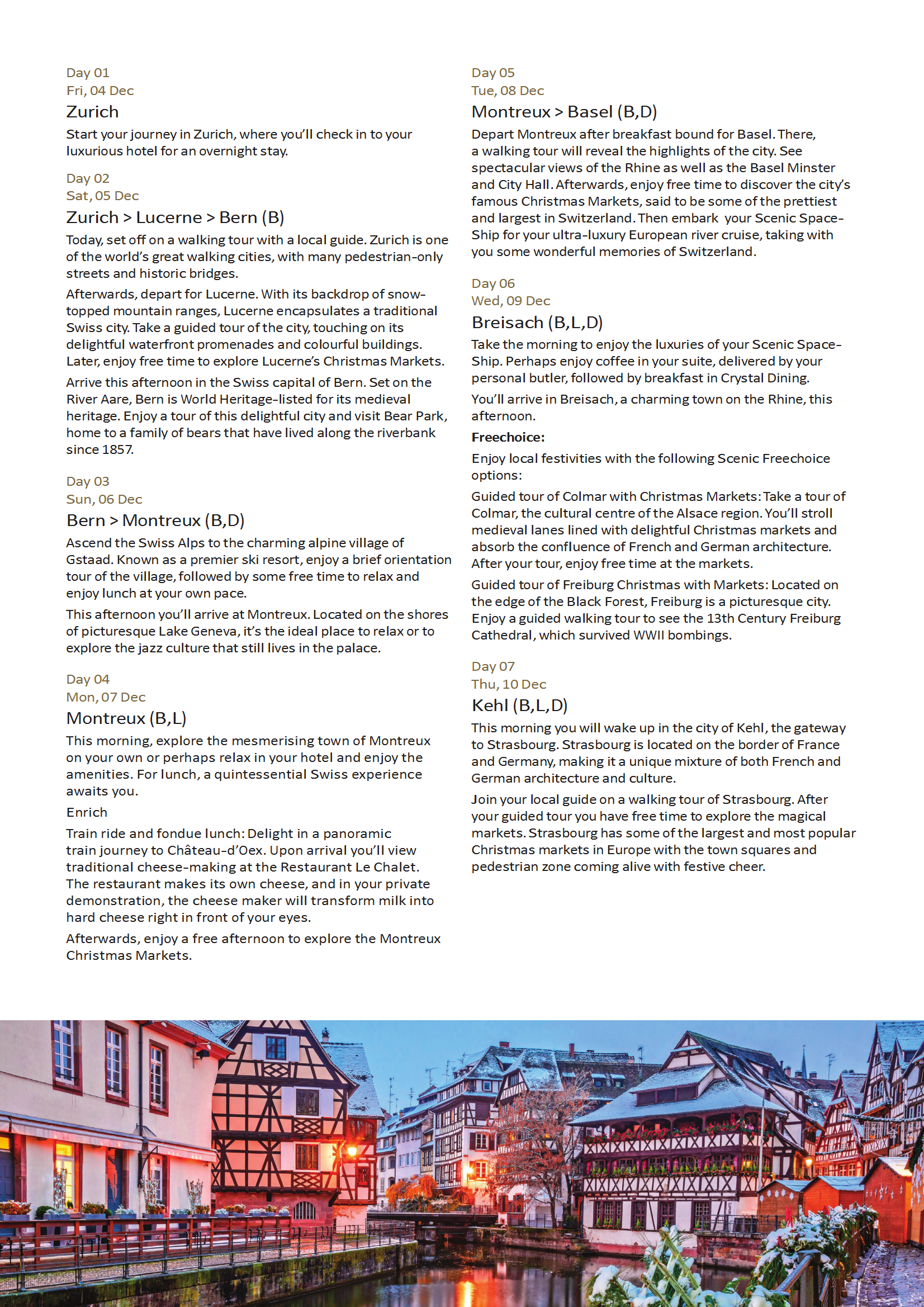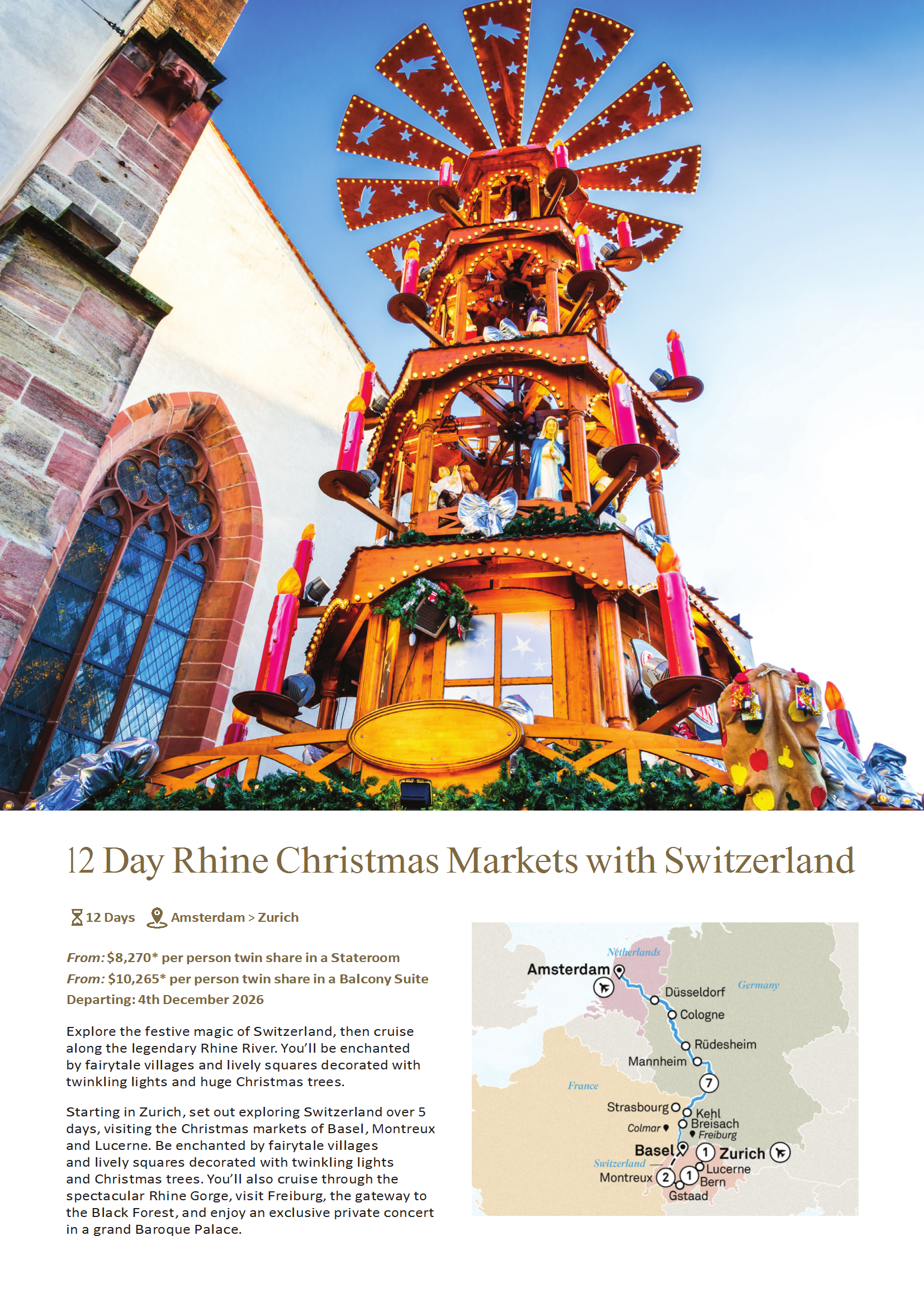 Explore the festive magic of Switzerland, then cruise along the legendary Rhine River. You’ll be enchanted by fairytale villages and lively squares decorated with twinkling lights and huge Christmas trees.